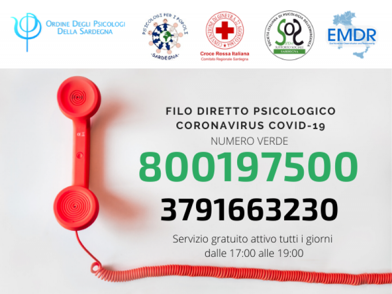 - Al filo diretto psicologico Coronavirus COVID-19: 379-1663230 servizio di assistenza psicologica in riferimento al Coronavirus COVID-19.