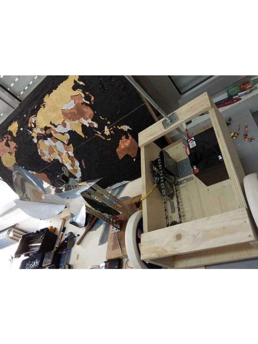 Un pannello di 133X70 cm rappresenta il planisfero realizzato con materiali di recupero: ritagli metallici, rame in fogli, alluminio da cucina, lamiera d'acciaio, fogli di ottone da bigiotteria.